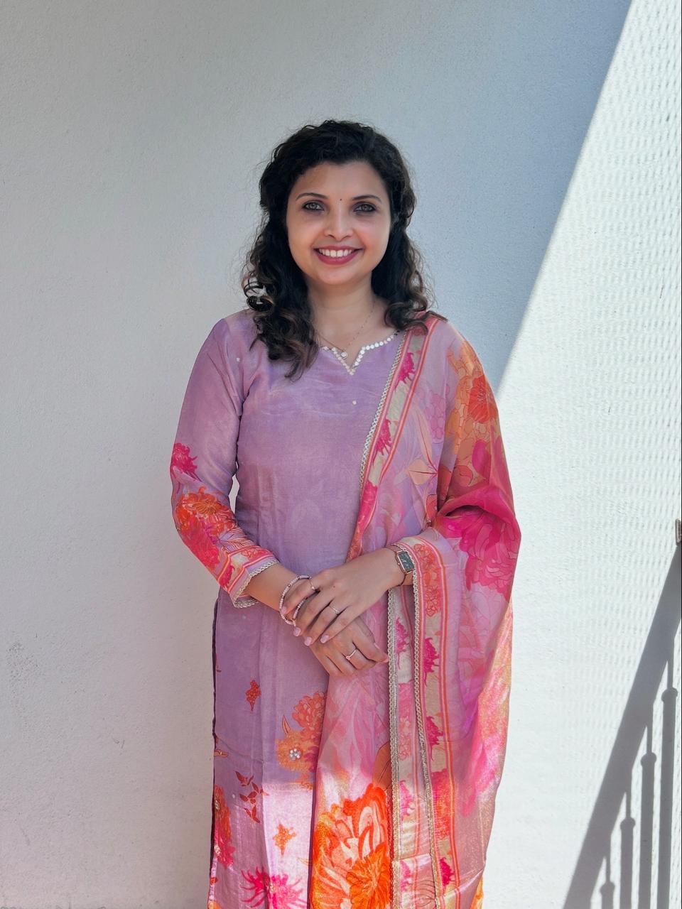 Shimmery Silk fabric with digital print on Kurta and sequins work on kurta yoke, Plain Bottom and Silk Dupatta